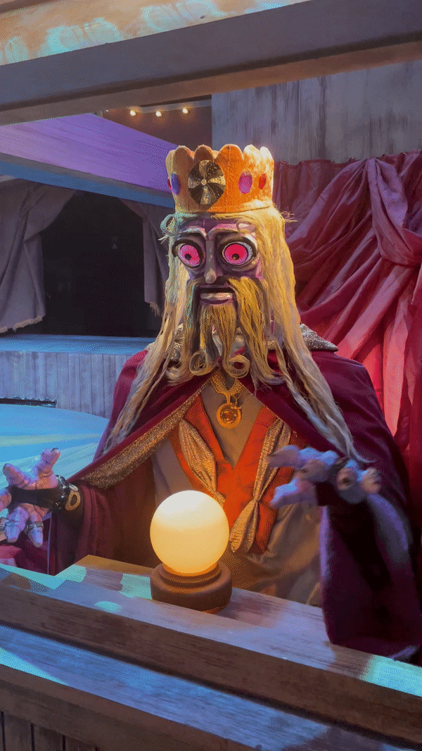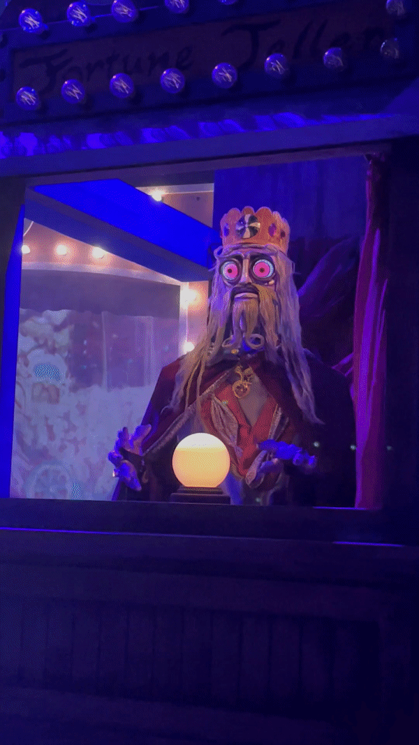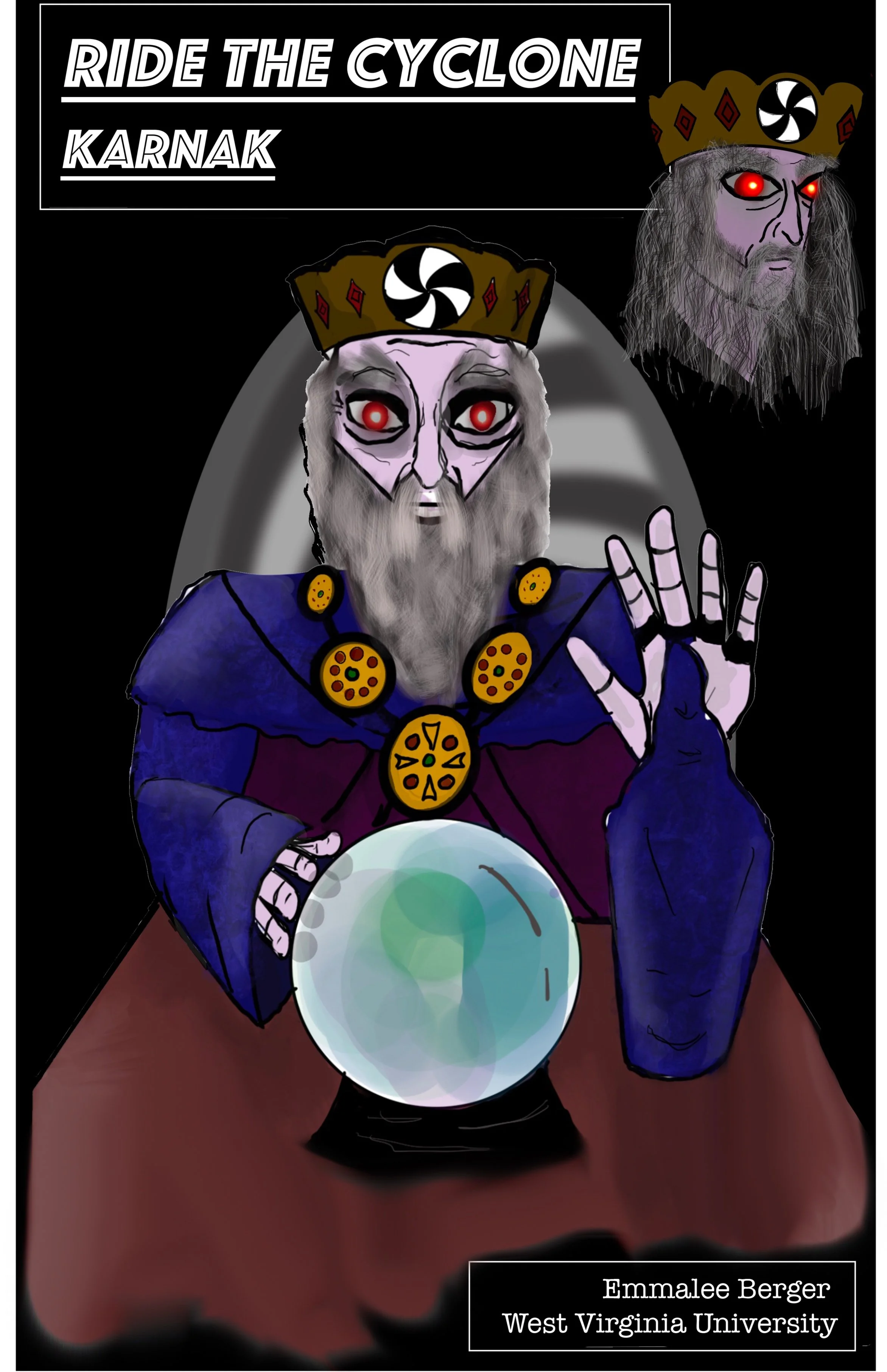 The Amazing KarnakRide the Cyclone Karnak is operated by two people, has light up eyes, and a hinged frame to allow him to tilt forward safely. Design for Karnak, as given to me by the designer. Process Shots Construction of the Frame Elbow Joint Base coat of paint Adding color Hair and Crown Karnak as he appeared on Stage
